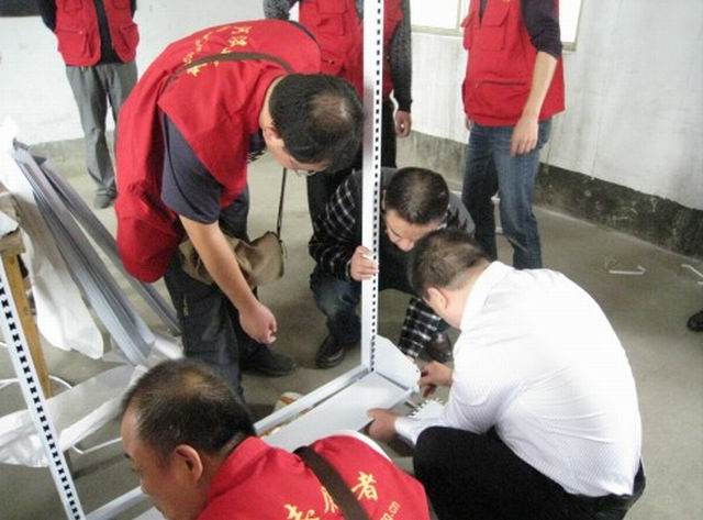 公司領(lǐng)導(dǎo)與志愿者一起安裝書架
